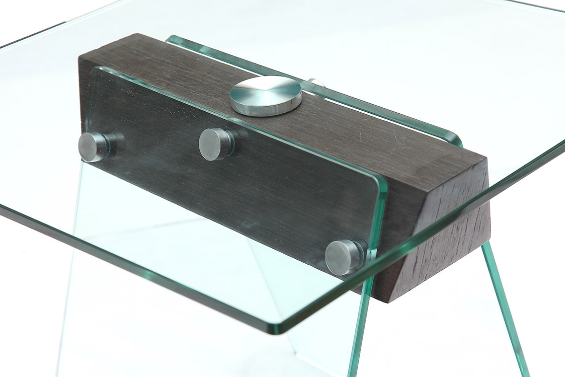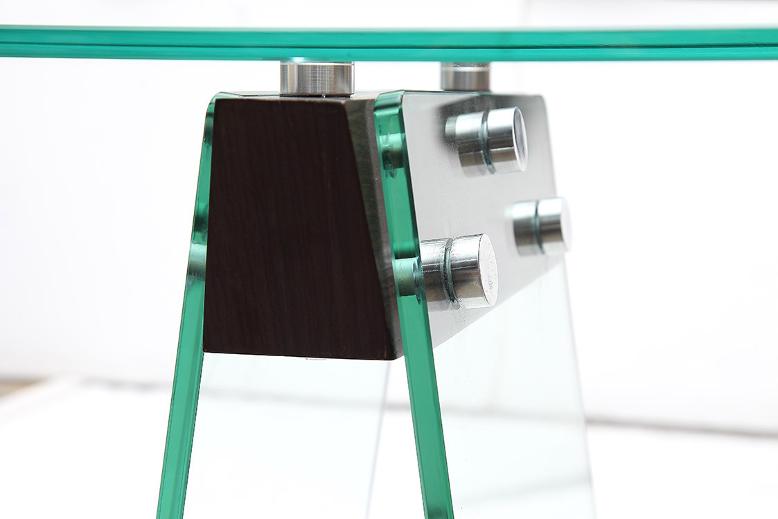 DESCRIPTION: Tempered 12mm clear glass top / legs with joint block in high gloss White / Dark Waln..