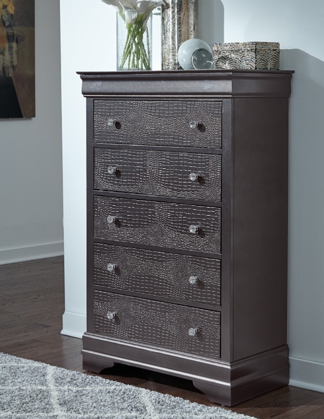 Features Tropical Wood (MDF and Veneers)Chrystal HardwareCrocodile Veneer FrontsMetallic White Finis..