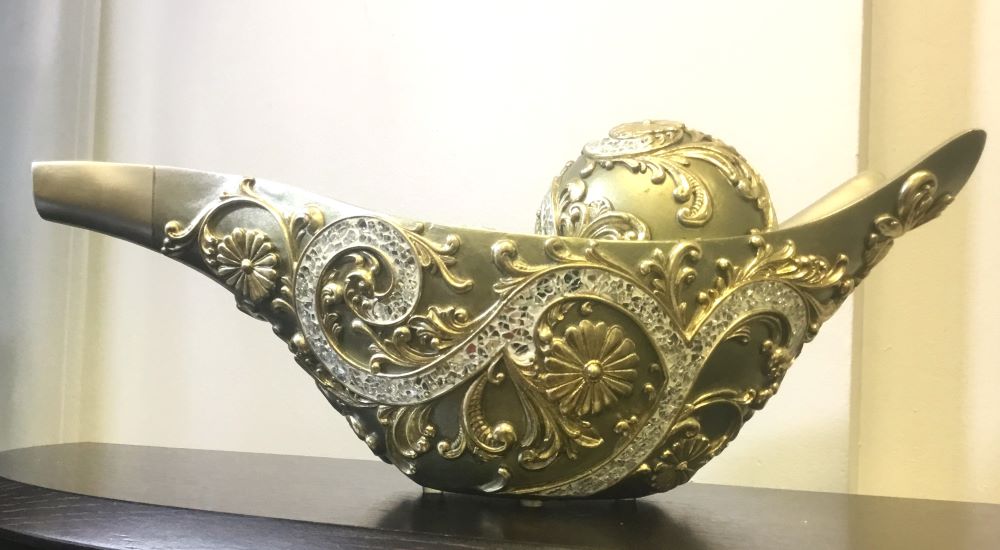 Has little pieces of glass placed together to form a decorative design. Placing this item on a coffee table adds a lovely effect to the room. Made of polyresin. To clean, use a damp cloth