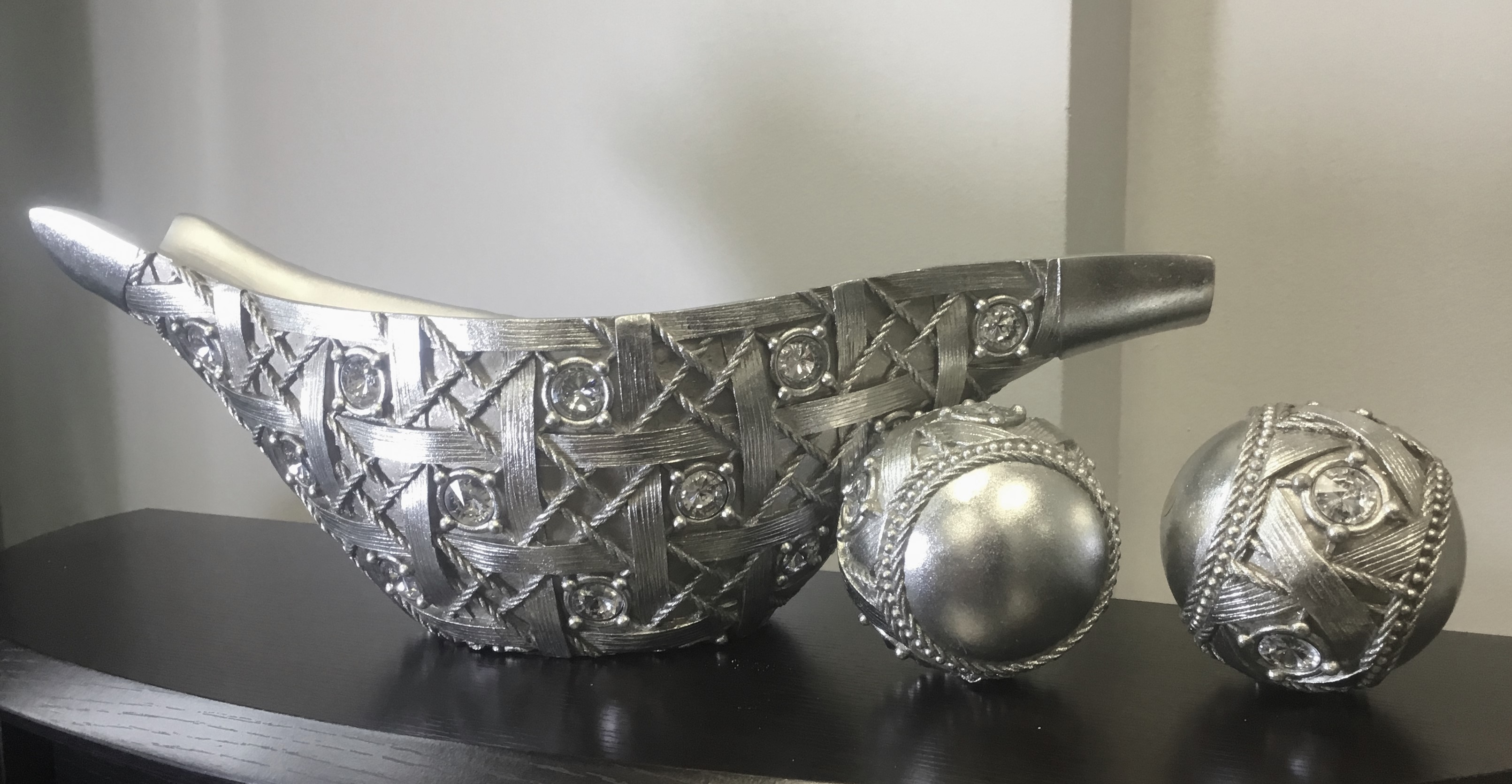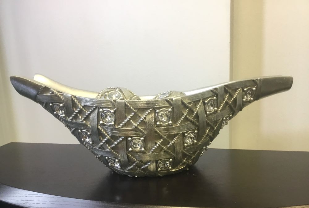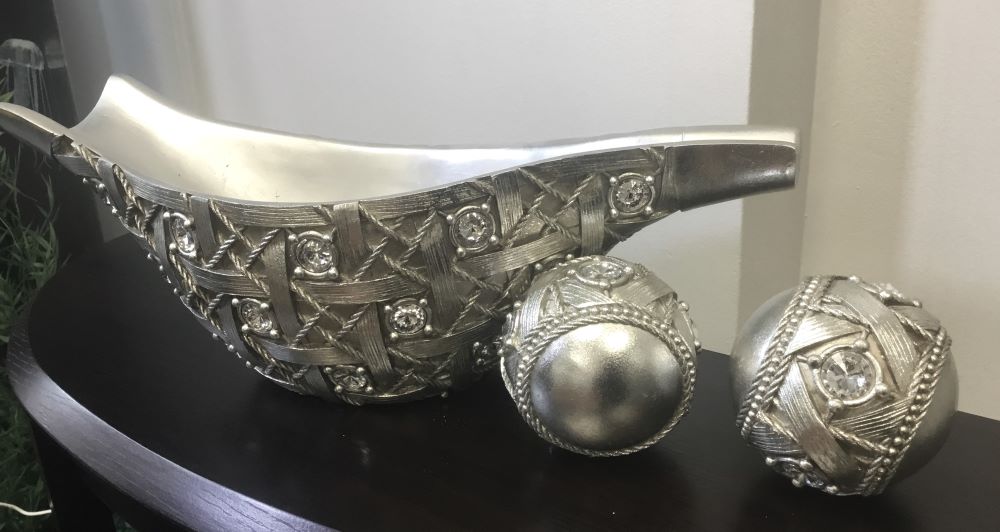 This beautiful Silver Malha decorative bowl with spheres is designed to a make memorable home decor collection that will accent your passion for design and elegance. Adds a majestic ambience to your home environment. Features a criss cross style with glass gem inserts. Made of polyresin and can be easily cleaned with a cloth. Includes two decorative spheres. Bowl opening measures 19 inches in width and 8 inches deep.