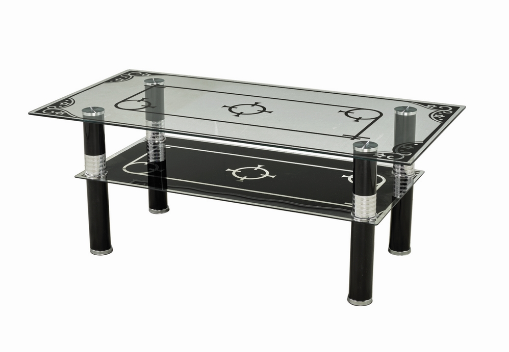 The Coffee Table is made with aluminium legs featuring a black finish. This coffee table features a black tinted glass shelf underneath the 6mm tempered glass table top with design along the glass. Product Dimensions: 43”L 22”W 17”H *6mm Tempered Glass