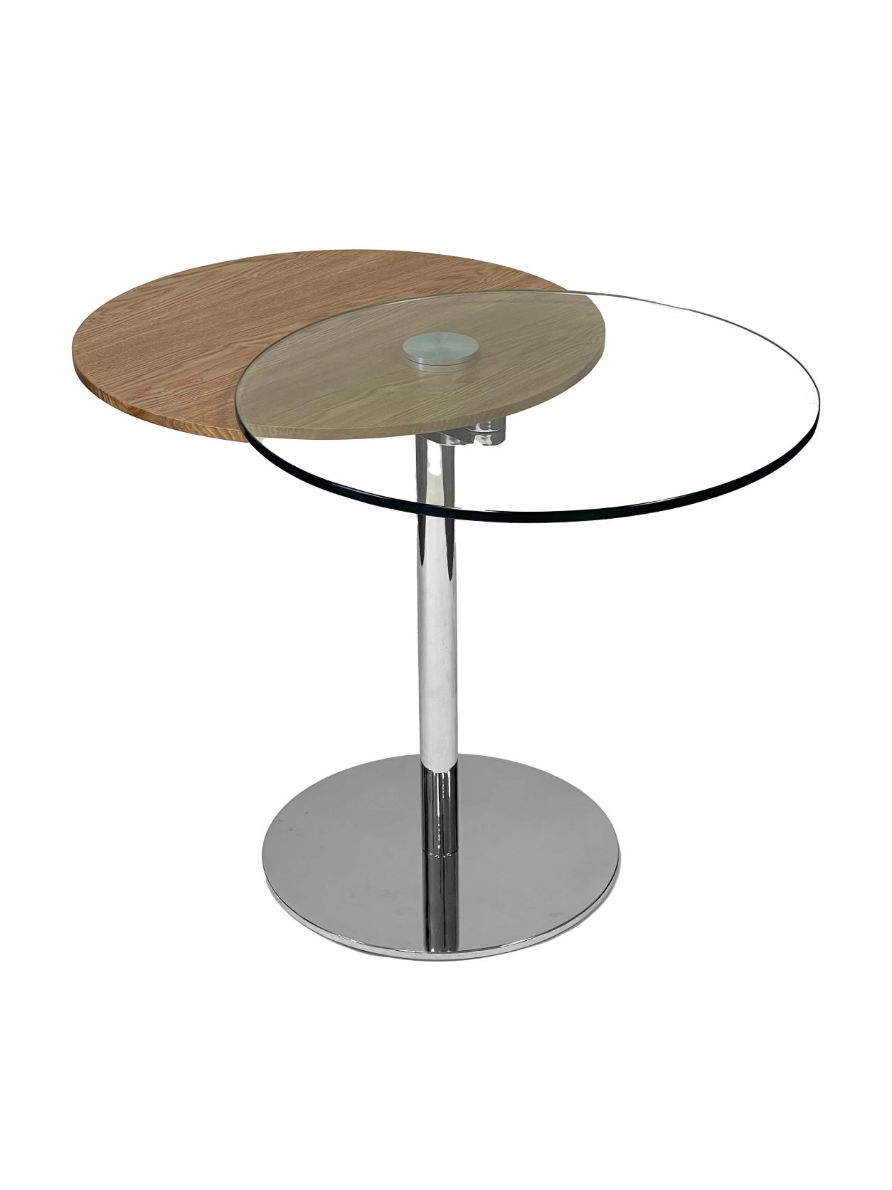 The end table features a tempered 12 mm swivelling glass top and a wood top, both of which are durable and complement each other nicely. The swivelling feature of the glass top allows for easy access to items on the table, while the wood top provides a warm and natural contrast to the sleekness of the glass.