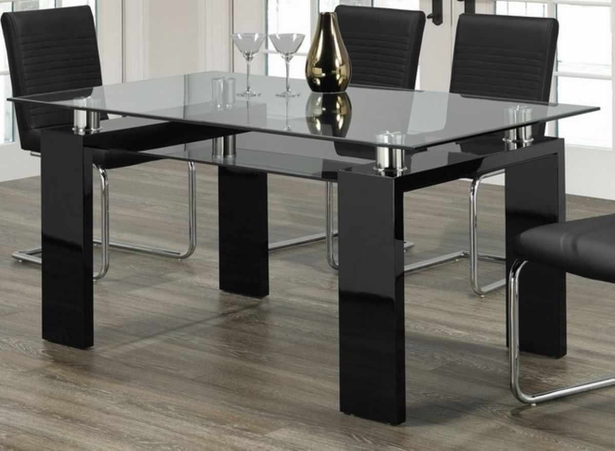 The Dining Table a tempered glass top and glossy black legs.