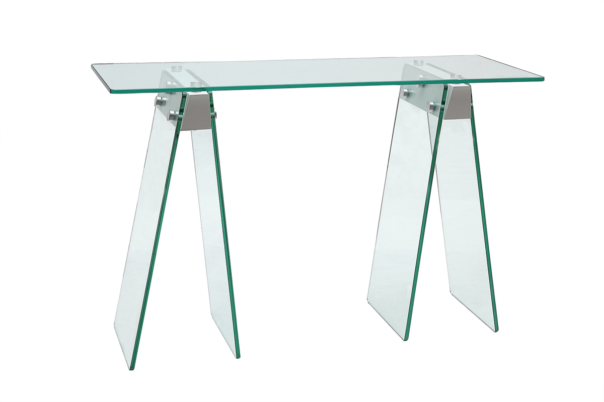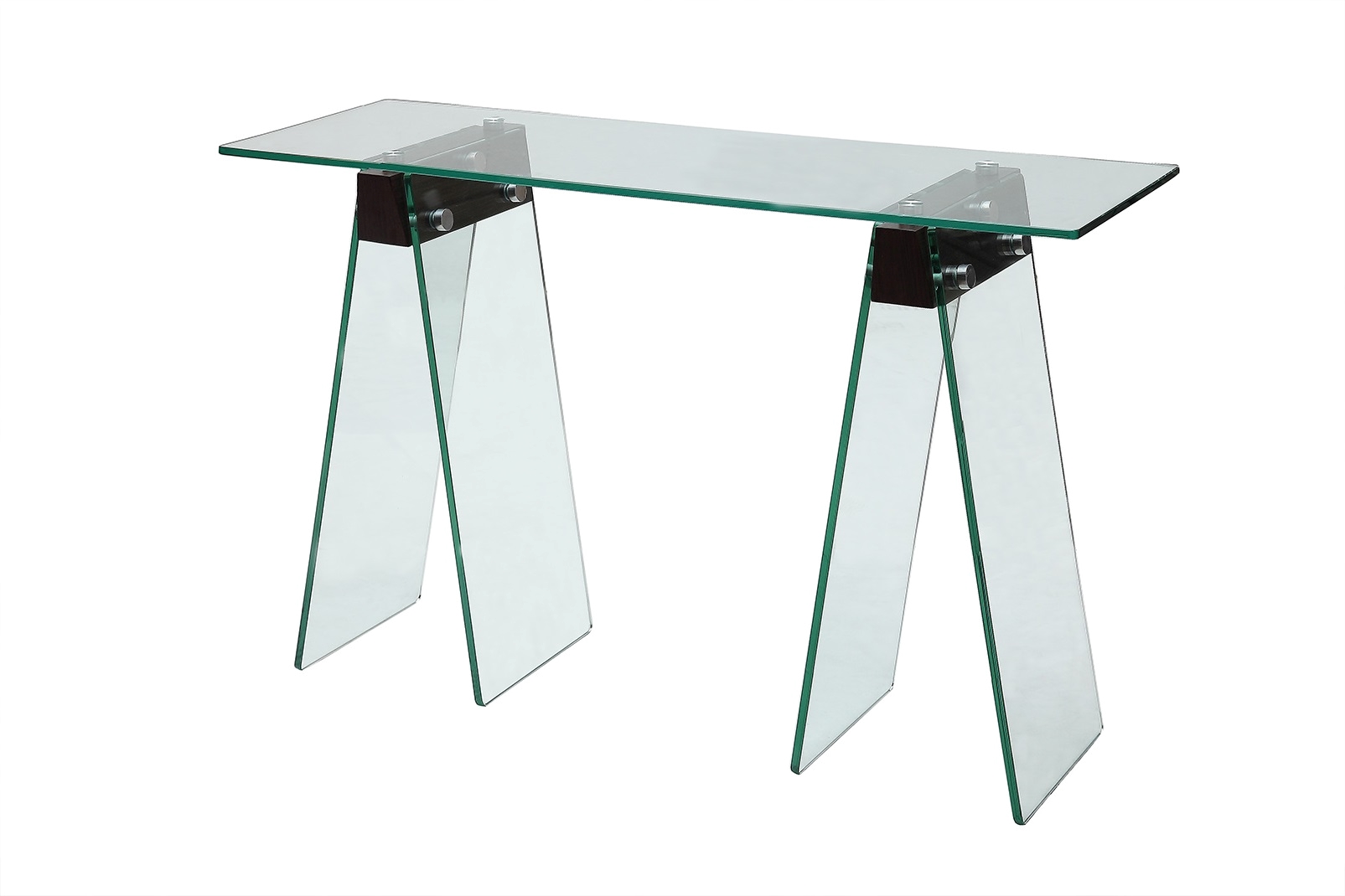 DESCRIPTION: Tempered 12mm clear glass top / legs with joint block in high gloss White / Dark Waln..