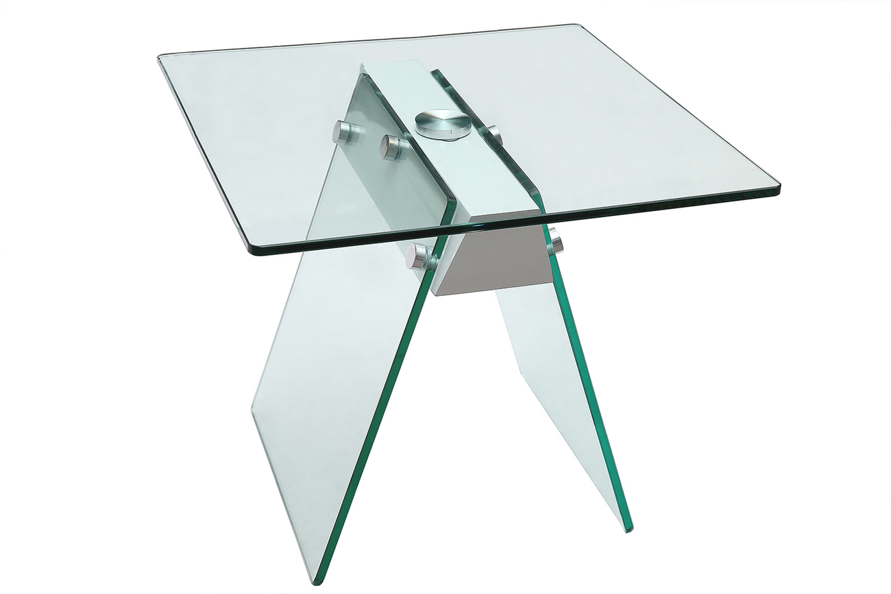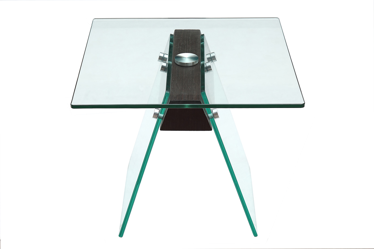 DESCRIPTION: Tempered 12mm clear glass top / legs with joint block in high gloss White / Dark Waln..