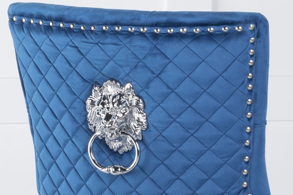 Blue Velvet Dining Chair with Lion Knocker, Polished Chrome Frame,