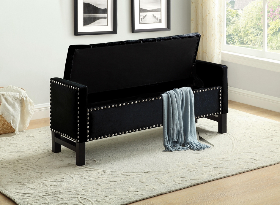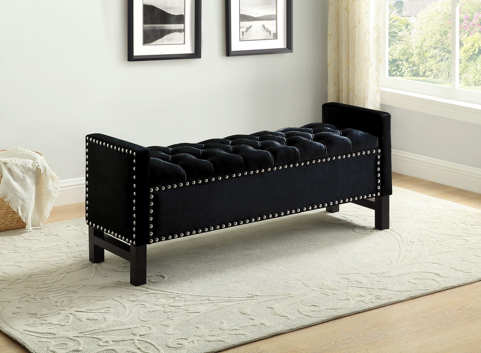 This storage bench features a nailhead trim, tufted seat, and comes in black velvet fabric.