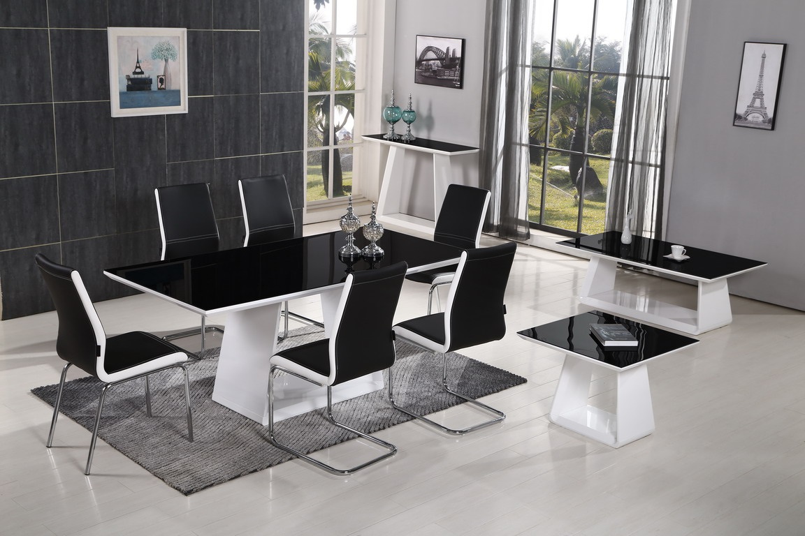DESCRIPTION: Black tempered glass table top and White high gloss lacquered middle frame & base.