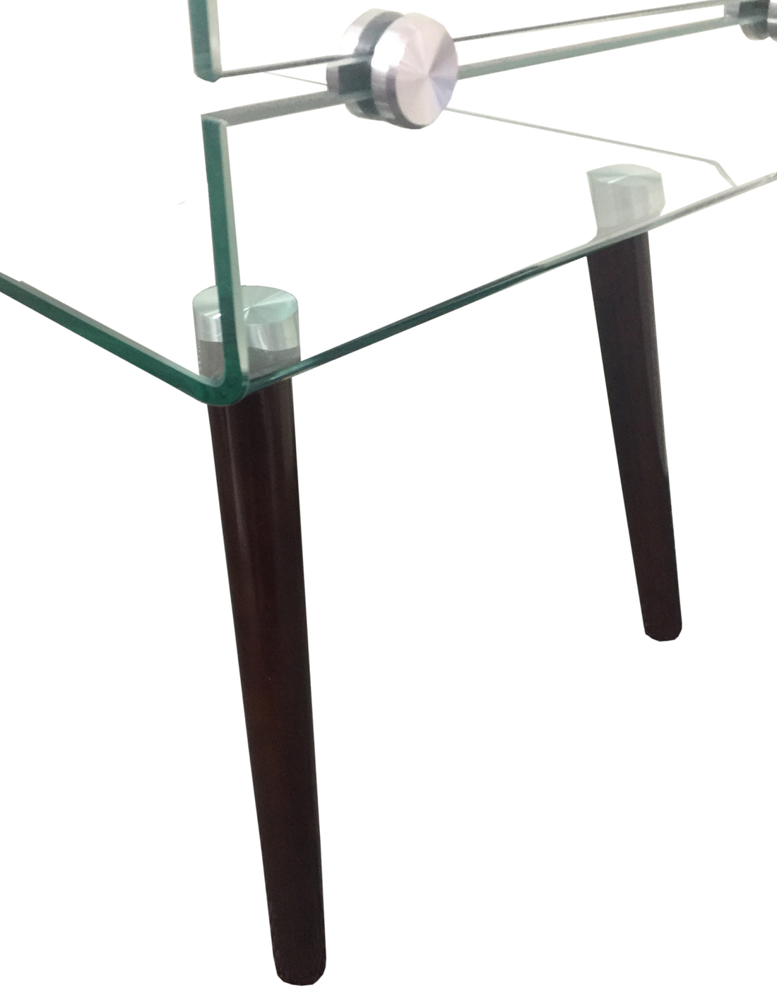 DESCRIPTION: Tempered 12 mm clear glass top with shelf and solid wood/metal legs.Colours: Dark Wal..